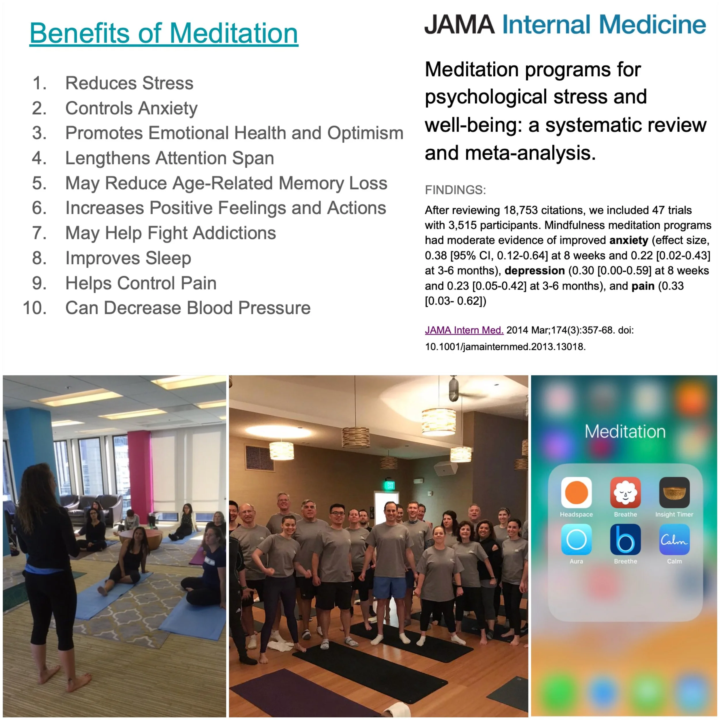 /There are thousands of studies that have shown mindfulness meditation can positively impact mental and physical health. Whether it's by reducing stress, improving sleep, increasing focus or improving relationships, research shows mindfulness works. That’s why I created this hands-on corporate wellness workshop were you’ll learn the science of meditation along with some simple tips for achieving success in your meditation practice. You’ll also have the opportunity to participate in a guided meditation as a group and enjoy some awesome "office yoga" led by my friend and yoga expert Ross McIntire. This workshop can be delivered in any office, conference room or even virtually. Download a copy of the presentation here. Message me for details.